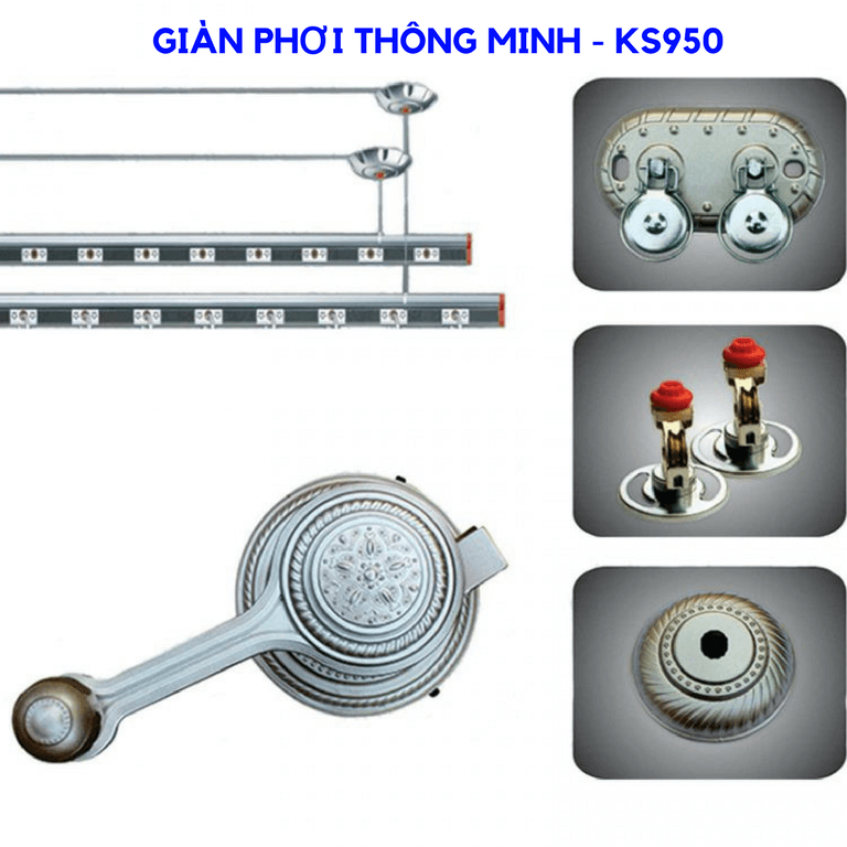 Bộ tời (tay quay) của giàn phơi thông minh kg950 được làm từ hợp kim nhôm nguyên khối, màu trắng sang trọng, tinh tế