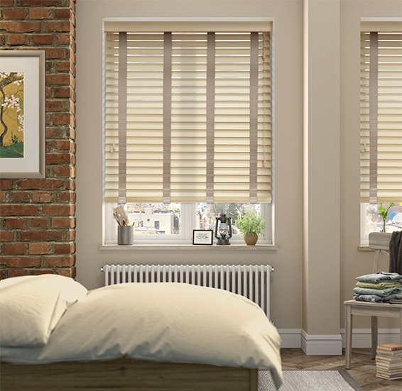 Những thanh gỗ rộng 50mm sành điệu, đặc biệt là khi được ghép nối với dây thang, trông tuyệt vời trong các cửa sổ có kích thước lớn. Phổ biến nhất là rèm gỗ màu trắng kết hợp với dây thang màu gỗ.